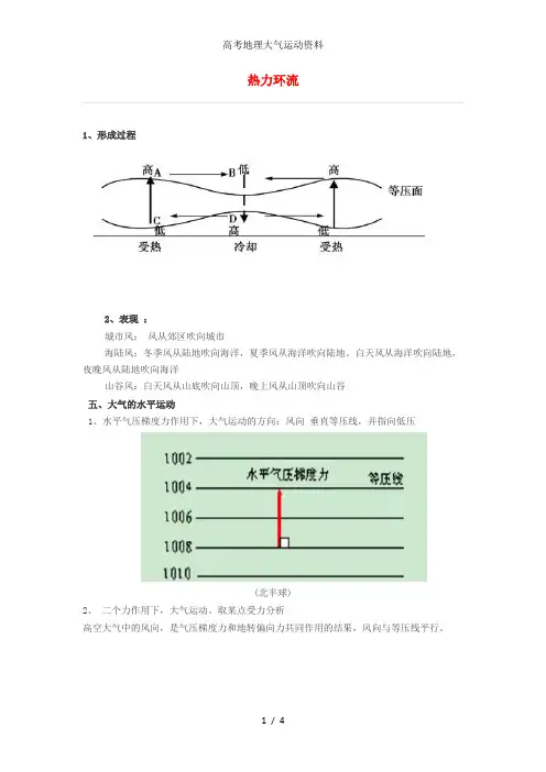 四、风的形成和分类风是大气运动的基本现象之一,由于地球自转和地球表面的不均热加热导致了风的形成。