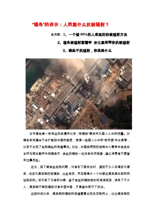 “福岛”的启示:人类靠什么抗核辐射?备用题:1、一个被99%的人忽视的防核辐射方法2、福岛核辐射敲警钟安化黑茶帮你抗核辐射3、碘盐不抗辐射,你选择什么日本福岛第一核电站机组爆炸以来,“核辐射”骤然成为国人心中的阴霾。