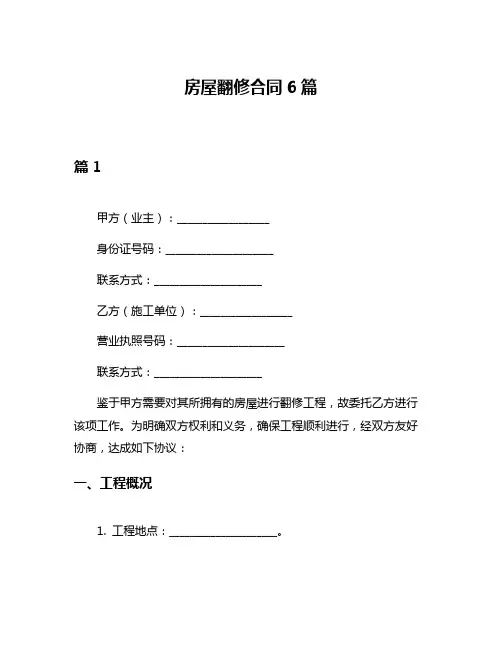 房屋翻修合同6篇篇1房屋翻修合同甲方(出租人):_________乙方(承租人):_________为了明确双方的权利和责任,特订立本翻修合同。