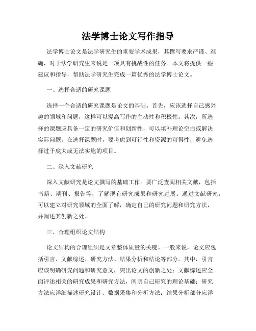 二、学术论文要求1. 撰写一篇法学研究论文,展示对特定法学问题的专项研究和深入理解;2. 论文应具有明确的研究目的、深入的文献综述、合理的研究方法、科学的数据分析以及创新的观点;3. 论文贡献度应体现在对相关领域的知识增加、理论探索、方法改进等方面;4. 论文应符合学术规范,包括准确引用参考文献、严密的逻辑结构和清晰的表达;5. 论文应为独立完成的学术成果,不能抄袭、剽窃或捏造数据。