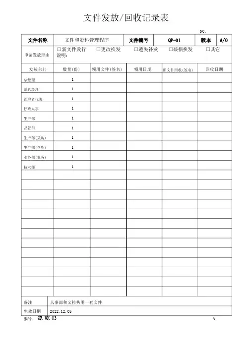 申请发放理由文件和资料管理程序□新文件发行□更改换发说明:□遗失补发□破损换发□其它发放部门数量(份) 领用文件(签名) 领用日期旧文件回收(签名) 回收日期总经理1副总经理1管理者代表1行政人事1生产部1品管部1生产部(采购) 1生产部(仓库) 1业务部(业务) 1技术部1备注生效日期人事部和文控共用一套文件2022.12.05申请发放理由质量记录管理程序□新文件发行□更改换发□遗失补发□破损换发□其它说明:发放部门数量(份) 领用文件(签名) 领用日期旧文件回收(签名) 回收日期总经理1副总经理1管理者代表1行政人事1生产部1品管部1生产部(采购) 1生产部(仓库) 1业务部(业务) 1技术部1备注生效日期人事部和文控共用一套文件2022.12.05申请发放理由供应/外包商评价程序□新文件发行□更改换发□遗失补发□破损换发□其它说明:发放部门数量(份) 领用文件(签名) 领用日期旧文件回收(签名) 回收日期总经理1副总经理1管理者代表1行政人事1生产部1品管部1生产部(采购) 1生产部(仓库) 1业务部(业务) 1技术部1备注生效日期人事部和文控共用一套文件2022.12.05申请发放理由顾客满意度评价程序□新文件发行□更改换发□遗失补发□破损换发□其它说明:发放部门数量(份) 领用文件(签名) 领用日期旧文件回收(签名) 回收日期总经理1副总经理1管理者代表1行政人事1生产部1品管部1生产部(采购) 1生产部(仓库) 1业务部(业务) 1技术部1备注生效日期人事部和文控共用一套文件2022.12.05NO.申请发放理由发放部门总经理副总经理管理者代表行政人事生产部品管部生产部(采购) 生产部(仓库) 业务部(业务) 技术部内部质量体系审核管理程序□新文件发行□更改换发说明:数量(份) 领用文件(签名)1111111111□遗失补发领用日期□破损换发□其它旧文件回收(签名) 回收日期备注生效日期人事部和文控共用一套文件2022.12.05申请发放理由不合格品管理程序□新文件发行□更改换发□遗失补发□破损换发□其它说明:发放部门数量(份) 领用文件(签名) 领用日期旧文件回收(签名) 回收日期总经理1副总经理1管理者代表1行政人事1生产部1品管部1生产部(采购) 1生产部(仓库) 1业务部(业务) 1技术部1备注生效日期人事部和文控共用一套文件2022.12.05申请发放理由纠正和预防措施管理程序□新文件发行□更改换发□遗失补发□破损换发□其它说明:发放部门数量(份) 领用文件(签名) 领用日期旧文件回收(签名) 回收日期总经理1副总经理1管理者代表1行政人事1生产部1品管部1生产部(采购) 1生产部(仓库) 1业务部(业务) 1技术部1备注生效日期人事部和文控共用一份文件. 2022.12.05。