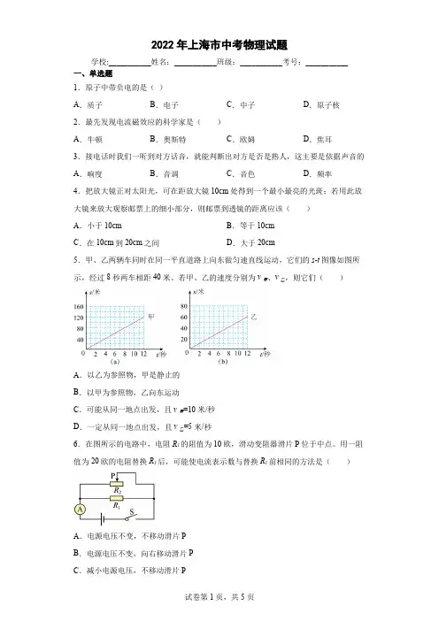 2022年上海市中考物理试题学校:___________姓名:___________班级:___________考号:___________一、单选题1.原子中带负电的是()A.质子B.电子C.中子D.原子核2.最先发现电流磁效应的科学家是()A.牛顿B.奥斯特C.欧姆D.焦耳3.接电话时我们一听到对方话音,就能判断出对方是否是熟人,这主要是依据声音的A.响度B.音调C.音色D.频率4.把放大镜正对太阳光,可在距放大镜10cm处得到一个最小最亮的光斑;若用此放大镜来放大观察邮票上的细小部分,则邮票到透镜的距离应该()A.小于10cm B.等于10cmC.在10cm到20cm之间D.大于20cm5.甲、乙两辆车同时在同一平直道路上向东做匀速直线运动,它们的s-t图像如图所示,经过8秒两车相距40米。