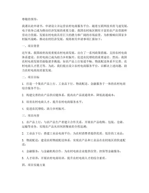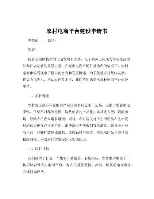 农村电商平台建设与运营项目申请尊敬的相关部门:我是来自农村的村民张三,我在这里申请农村电商平台的建设与运营项目。