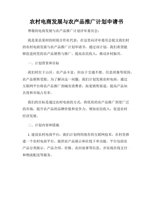 创业扶持申请书开设农村电商平台促进农产品销售尊敬的相关部门:我是××县××乡××村的村民,计划在我所在的农村开设一个电商平台,旨在促进农产品的销售,并为农民提供更多的创业机会。
