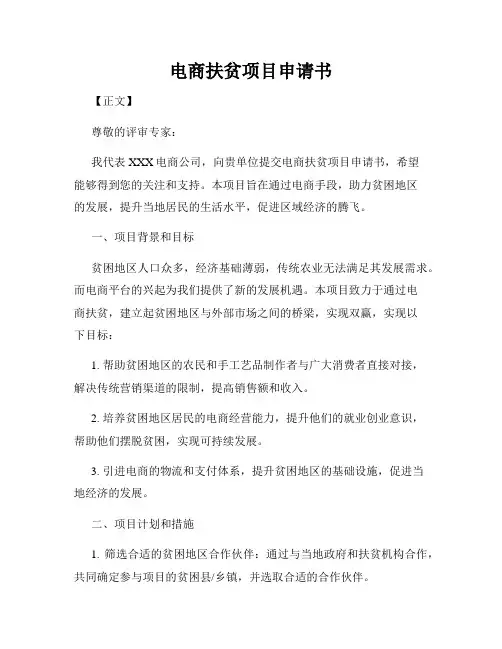 电商扶贫项目申请书【正文】尊敬的评审专家:我代表XXX电商公司,向贵单位提交电商扶贫项目申请书,希望能够得到您的关注和支持。