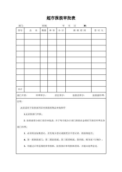2.防损部需分部门保存审批表,并于每月底合计部门报损总金额后呈报店经理及各部门经理;