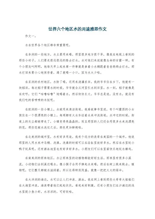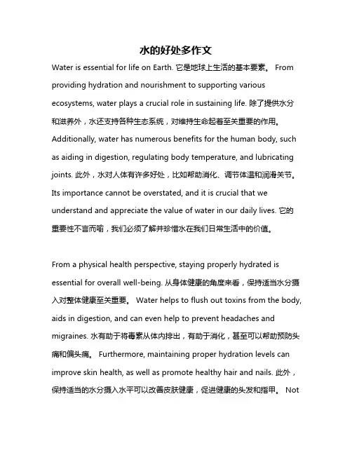 水的作用作文英文回答:Water is essential for life on Earth. It makes up about 71% of the Earth's surface and is found in all living organisms. Water is used by plants and animals for avariety of purposes, including hydration, temperature regulation, and waste removal. It is also used in a variety of human activities, such as drinking, bathing, cooking, and irrigation.Water is a versatile substance that can exist in three states: solid, liquid, and gas. In its solid state, wateris known as ice. Ice is less dense than liquid water, which is why it floats on top of water. In its liquid state, water is known as water. Water is a good solvent, which means that it can dissolve many different substances. Inits gaseous state, water is known as water vapor. Water vapor is lighter than air, which is why it rises into the atmosphere.The water cycle is the continuous movement of water between the Earth's surface and the atmosphere. Water evaporates from the Earth's surface into the atmosphere. In the atmosphere, water vapor condenses to form clouds.Clouds can then produce precipitation, which is water that falls from the sky. Precipitation can take the form of rain, snow, sleet, or hail.Water is a renewable resource, but it is important to conserve water because it is not always available in clean and safe conditions. Water conservation can be achieved by reducing water consumption and by recycling water.中文回答:水是地球上生命必需的元素。