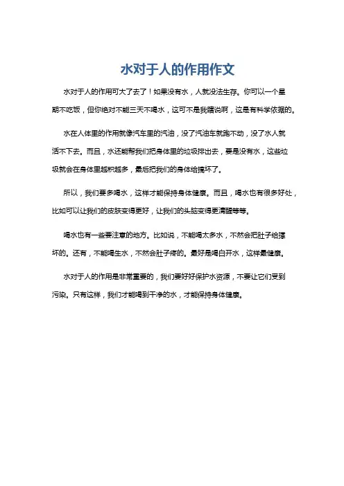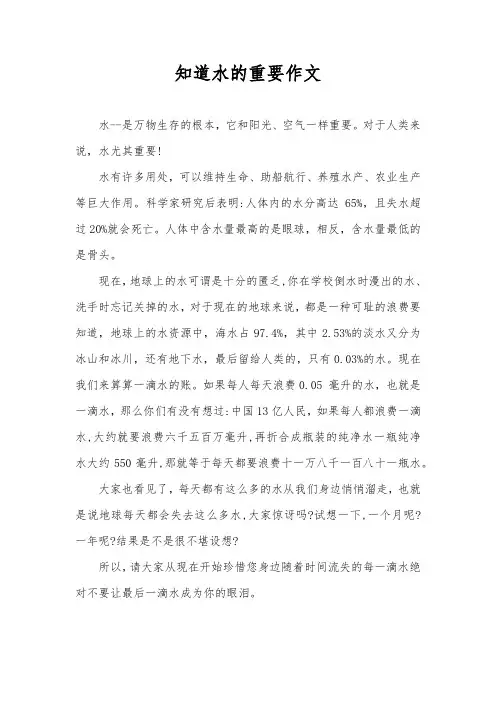因而,作为一名中国小学生,我们更加应当踊跃地参加到珍惜水资源的行动中来,在生活中节约每一滴水!一旦人们都意识到水资源的重要性,地球上的水资源危机就可能解除!觉醒吧,人类!不要让眼泪成为我们地球上最终的一滴水!水的重要性初三作文2人体有着90%以上的水,因此水是必不行少的。