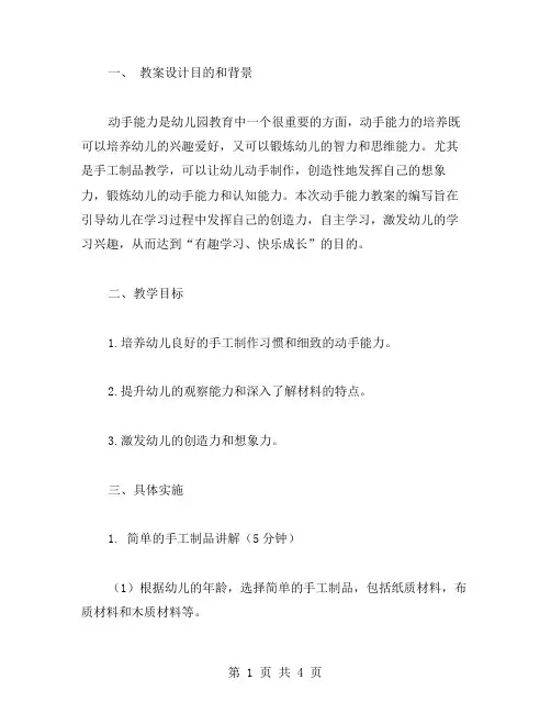一、教案设计目的和背景动手能力是幼儿园教育中一个很重要的方面,动手能力的培养既可以培养幼儿的兴趣爱好,又可以锻炼幼儿的智力和思维能力。