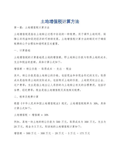 土地增值税计算方法第一篇:土地增值税计算方法土地增值税是指在土地转让过程中征收的一种税费,用于调节土地利用、保障公共利益和促进经济的可持续发展。