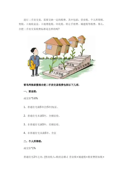 进行二手房交易,需要交纳一定的税费,其中包括:营业税、个人所得税、契税、土地收益金、土地增值税、印花税、转让手续费、城建税等税费,那么,合肥二手房交易税费标准是怎样的呢?雷鸟网独家整理合肥二手房交易税费包括以下几项:一、营业税:成交价*5.6%1、普通住宅满5年(含5年)免征。