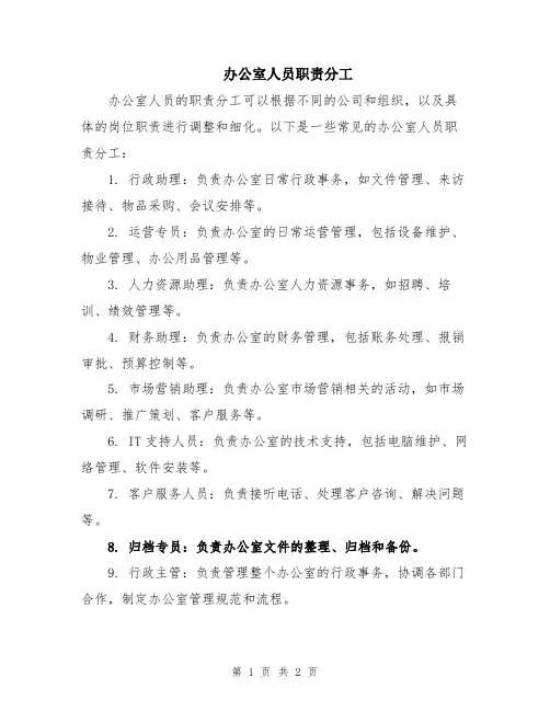 办公室人员职责分工一、任务背景办公室是一个组织内部重要的运营部门,承担着协调、管理和支持各个部门的职责。