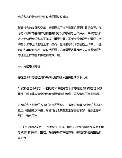 二、整改措施针对意识形态迎检资料存在缺档的问题,下面提出以下整改措施:1. 加强资料管理。