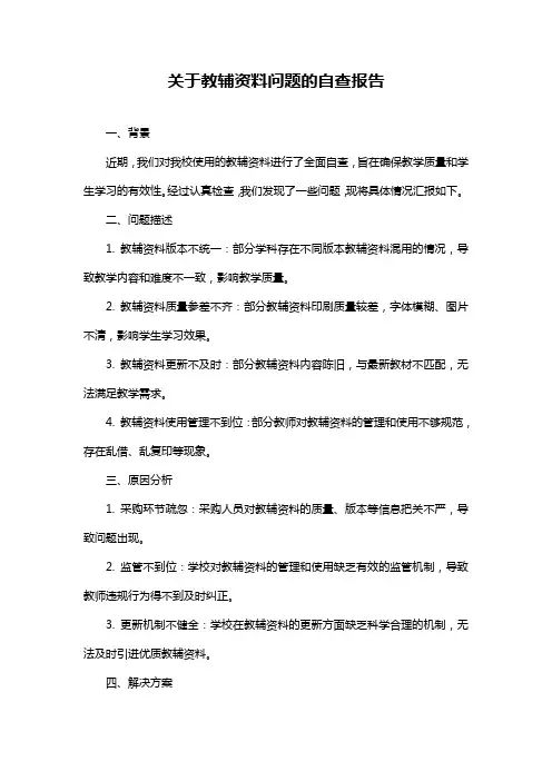 关于教辅资料问题的自查报告一、背景近期,我们对我校使用的教辅资料进行了全面自查,旨在确保教学质量和学生学习的有效性。
