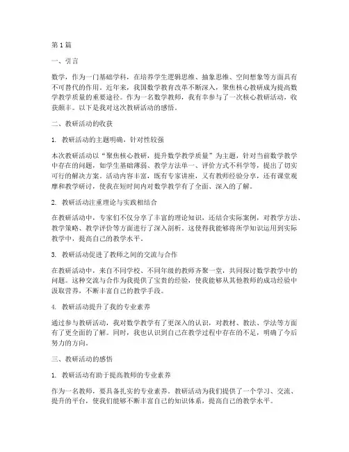 二、教研活动的收获1. 教研活动的主题明确,针对性较强本次教研活动以“聚焦核心教研,提升数学教学质量”为主题,针对当前数学教学中存在的问题,如学生基础薄弱、教学方法单一、评价方式不科学等,提出了切实可行的解决方案。