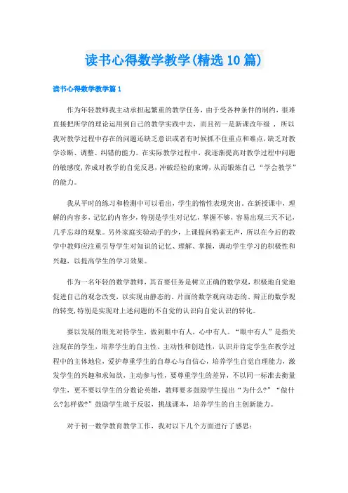 读书心得数学教学(精选10篇)读书心得数学教学篇1作为年轻教师我主动承担起繁重的教学任务,由于受各种条件的制约,很难直接把所学的理论运用到自己的教学实践中去,而且初一是新课改年级 , 所以我对教学过程中存在的问题还缺乏意识或者有时候抓不住重点和难点,缺乏对教学诊断、调整、纠错的能力。