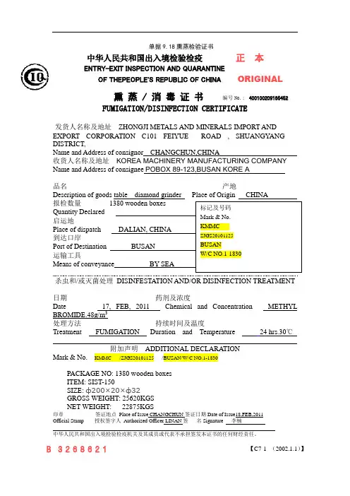 单据9.18熏蒸检验证书中华人民共和国出入境检验检疫 正 本ENTRY-EXIT INSPECTION AND QUARANTINEOF THEPEOPLE'S REPUBLIC OF CHINA ORIGINAL熏 蒸 / 消 毒 证 书 编号No.: 400100209165452FUMIGATION/DISINFECTION CERTIFICATE发货人名称及地址 ZHONGJI METALS AND MINERALS IMPORT ANDEXPORT CORPORATION C101 FEIYUE ROAD , SHUANGYANG DISTRICT,Name and Address of consignor CHANGCHUN,CHINA 收货人名称及地址 KOREA MACHINERY MANUFACTURING COMPANY Name and Address of consignee POBOX 89-123,BUSAN KORE A品名 产地Description of goods table diamond grinder Place of Origin CHINA 报检数量 1380 wooden boxes Quantity Declared 启运地 Place of dispatch DALIAN, CHINA 到达口岸Port of Destination BUSAN运输工具Means of conveyance BY SEA杀虫和/或灭菌处理 DISINFESTATION AND/OR DISINFECTION TREATMENT日期 药剂及浓度Date 17, FEB, 2011 Chemical and Concentration METHYL BROMIDE.48g/m 3处理方法 持续时间及温度 Treatment FUMIGATION Duration and Temperature 24 hrs.30℃附加声明 ADDITIONAL DECLARATIONMark & No. KMMC /ZJGS20101125 /BUSAN/W/C NO.1-1830PACKAGE NO: 1380 wooden boxesITEM: SIST-150SIZE: ф200×20×ф32GROSS WEIGHT: 25620KGSNET WEIGHT: 22875KGS印章 签证地点 Place of Issue CHANGCHUN 签证日期Date of Issue18,FEB,2011Official Stamp 授权签字人 Authorized Officer LINAN 签 名Signature 李楠中华人民共和国出入境检验检疫机关及其成员或代表不承担签发本证书的任何财经责任。
