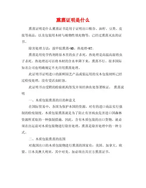 熏蒸证明是什么熏蒸证明是什么薰蒸证书是用于证明出口粮谷、油籽、豆类、皮张等商品,以及包装用木材与植物性填充物等,已经过熏蒸灭虫的证书。