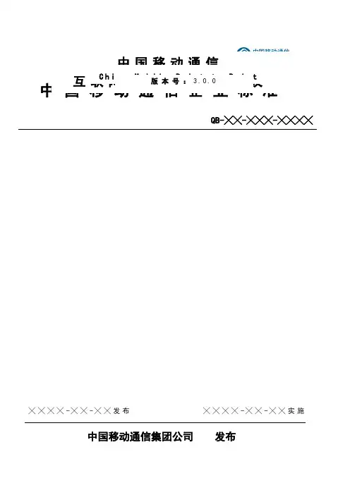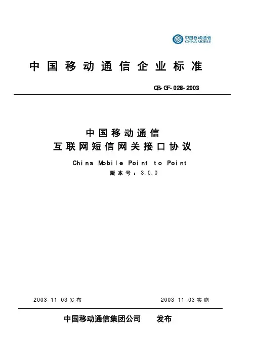 中国移动通信CHINA MOBILE中国移动通信企业标准QB-XX - XXX - XXXX中国移动通信互联网短信网关接口协议Chi na Mobi I e Poi nt t o Poi nt版本号:3. 0. 0XXXX - XX - XX 发布XXXX - XX - XX 实施中国移动通信集团公司发布目录1 范围 (1)2 引用标准 (1)3 术语和定义 (1)4 网络结构 (2)5 CMPP 功能概述 (3)6 协议栈 (3)7 通信方式 (3)7.1 长连接 (4)7.2 短连接 (6)7.3 本协议涉及的端口号 (6)7.4 交互过程中的应答方式 (7)8 消息定义 (7)8.1 基本数据类型 (7)8.2 消息结构 (7)8.3 消息头格式( Message Header ) (8)8.4 业务提供商(SP)与互联网短信网关(ISMG)间的消息定义 (8)8.4.1 SP请求连接到ISMG (CMPP_CONNECT )操作 (8)8.4.1.1 CMPP_CONNECT 消息定义( SP ISMG ) (8)8.4.1.2 CMPP_CONNECT_RESP 消息定义( ISMG SP) (9)8.4.2 SP 或ISMG请求拆除连接(CMPP_TERMINATE )操作 (9)842.1 CMPP_TERMINATE 消息定义(SP ISMG 或 ISMG SP) 98.4.2.2 CMPP_TERMINATE_RESP 消息定义( SP ISMG 或 ISMG SP) (9)8.4.3 SP 向ISMG提交短信(CMPP_SUBMIT )操作 (10)8.4.3.1 CMPP_SUBMIT 消息定义( SP ISMG) (10)8.4.3.2 CMPP_SUBMIT_RESP 消息定义( ISMG SP) (11)8.4.4 SP 向 ISMG 查询发送短信状态( CMPP_QUERY )操作 (12)8.4.4.1 CMPP_QUERY 消息的定义( SP ISMG ) (12)8.4.4.2 CMPP_QUERY_RESP 消息的定义( ISMG SP) (13)8.4.5 ISMG 向 SP 送交短信( CMPP_DELIVER )操作 (13)8.4.5.1 CMPP_DELIVER 消息定义( ISMG SP) (13)8.4.5.2 CMPP_DELIVER_RESP 消息定义( SP ISMG ) (16)8.4.6 SP 向 ISMG 发起删除短信( CMPP_CANCEL )操作 (16)8.4.6.1 CMPP_CANCEL 消息定义( SP ISMG ) (17)8.4.6.2 CMPP_CANCEL_RESP 消息定义( ISMG SP ) (17)8.4.7 链路检测( CMPP_ACTIVE_TEST )操作 (17)8.4.7.1 CMPP_ACTIVE_TEST 定义( SP ISMG 或 ISMG SP) (17)8.4.7.2 CMPP_ACTIVE_TEST_RESP 定义( SP ISMG 或 ISMG SP) (17)8.5 互联网短信网关 (ISMG) 之间的消息定义 (17)8.5.1 源 ISMG 请求连接到目的 ISMG ( CMPP_CONNECT )操作 (17)8.5.2 源 ISMG 请求拆除到目的 ISMG 的连接( CMPP_TERMINATE )操作 (17)8.5.3 链路检测( CMPP_ACTIVE_TEST )操作 (18)8.5.4 源 ISMG 向目的 ISMG 转发短信( CMPP_FWD )操作 (18)8.5.4.1 CMPP_FWD 定义( ISMG ISMG ) (18)8.5.4.2 CMPP_FWD_RESP 定义( ISMG ISMG ) (21)8.6 互联网短信网关 (ISMG) 与汇接网关 (GNS) 之间的消息定义 (22)8.6.1 ISMG 请求连接到 GNS 或 GNS 请求连接到 ISMG (CMPP_CONNECT )操作 2 28.6.2 ISMG 请求拆除到 GNS 的连接或 GNS 请求拆除到 ISMG 的连接( CMPP_TERMINATE )操作 (22)8.6.3 ISMG 向汇接网关查询 MT 路由( CMPP_MT_ROUTE )操作 (22)8.6.3.1 CMPP_MT_ROUTE 消息定义( ISMG GNS ) (22)8.6.3.2 CMPP_MT_ROUTE_RESP 消息定义( GNS ISMG ) (22)8.6.4 ISMG 向汇接网关查询 MO 路由( CMPP_MO_ROUTE )操作 (23)8.6.4.1 CMPP_MO_ROUTE 消息定义( ISMG GNS ) (23)8.6.4.2 CMPP_MO_ROUTE_RESP 消息定义( GNS ISMG ) (23)8.6.5 ISMG 向汇接网关获取 MT 路由( CMPP_GET_MT_ROUTE )操作 (24)8.6.5.1 CMPP_GET_MT_ROUTE 消息定义( ISMG GNS ) . (24)8.6.5.2 CMPP_GET_ ROUTE_RESP 消息定义( GNS ISMG ) (24)8.6.6 SMG 向汇接网关获取 MO 路由( CMPP_GET_MO_ROUTE )操作 (25)8.6.6.1 CMPP_GET_MO_ROUTE 消息定义( ISMG GNS ) (25)8.6.6.2 CMPP_GET_MO_ROUTE_RESP 消息定义( GNS ISMG ) (26)8.6.7 ISMG 向汇接网关更新 MT 路由( CMPP_MT_ROUTE_UPDATE )操作 (26)8.6.7.1 CMPP_MT_ROUTE_UPDATE 消息定义( ISMG GNS ) (27)8.6.7.2 CMPP_MT_ROUTE_UPDATE_RESP 消息定义( GNS ISMG ) (27)8.6.8 ISMG 向汇接网关更新 MO 路由( CMPP_MO_ROUTE_UPDATE )操作 (28)8.6.8.1 CMPP_MO_ROUTE_UPDATE 消息定义( ISMG GNS ) (28)8.6.8.2 CMPP_MO_ROUTE_UPDATE_RESP 消息定义( GNS ISMG ) (28)8.6.9 汇接网关向 ISMG 更新 MT 路由( CMPP_PUSH_MT_ROUTE_UPDATE )操作 (29)8.6.9.1 CMPP_PUSH_MT_ROUTE_UPDATE 消息定义( GNS ISMG ) (29)8.6.9.2 CMPP_PUSH_MT_ROUTE_UPDATE_RESP 消息定义( ISMG GNS )...................... 3 08.6.10 汇接网关向 ISMG 更新 MO 路由( CMPP_PUSH_MO_ROUTE_UPDATE )操作 ..308.6.10.1 CMPP_PUSH_MO_ROUTE_UPDATE 消息定义( GNS ISMG ) (30)8.6.10.2 CMPP_PUSH_MO_ROUTE_UPDATE_RESP 消息定义( ISMG GNS ) ..318.7 系统定义 (31)8.7.1 Command_Id 定义 (31)8.7.2 错误码使用说明 (32)8.7.3 ISMG 与 GNS 之间消息使用的错误码定义 (32)8.7.4 GNS 上路由信息的Route_Id 的编号规则 (33)9 附录 1 短信群发功能的实现 (34)10 附录 2 GNS 协议目前实现说明 (34)11 修订历史 (36)、八前言本规范规定了移动梦网短信业务开展过程中各网元(包括ISMG 、GNS 和 SP )之间的消息类型和定义,目前为 3.0.0 版本,是在原来 2.1.0 版本的基础上进行修订而成。