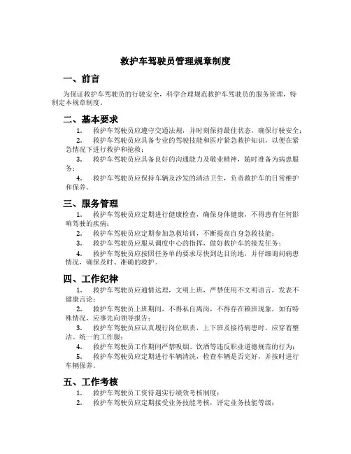 四、驾驶员的管理措施1.培训和考核:医院负责对驾驶员进行岗前培训和定期举行救护车驾驶技能考核,确保驾驶员具备相关的专业知识和技能。