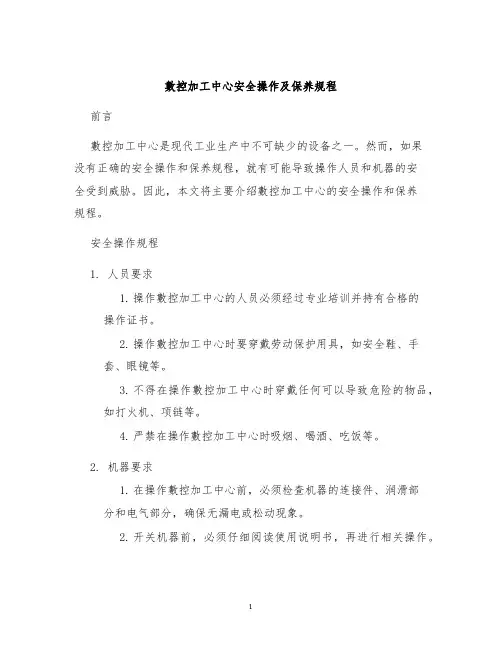 第二部分:维护注意事项1. 保持环境清洁数控加工中心应放置在干燥、通风、无尘的环境中,避免灰尘和潮湿对机床造成影响。