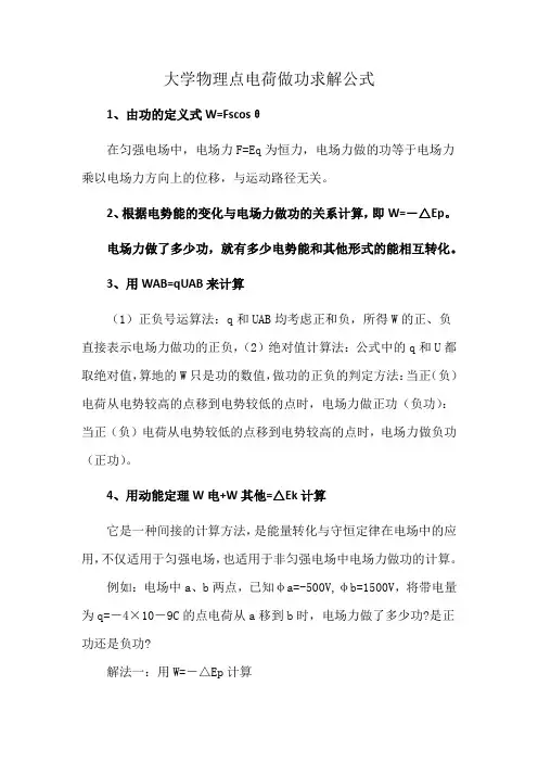 大学物理点电荷做功求解公式1、由功的定义式W=Fscosθ在匀强电场中,电场力F=Eq为恒力,电场力做的功等于电场力乘以电场力方向上的位移,与运动路径无关。