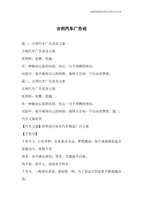 吉利广告语篇一:吉利汽车广告语及文案吉利汽车广告语及文案优利欧:优雅,优越有一种触动心弦的风度,给心一万个奔腾的理由,沉稳中,毫不掩饰自己的热情,演绎人生每一个自由的梦想。