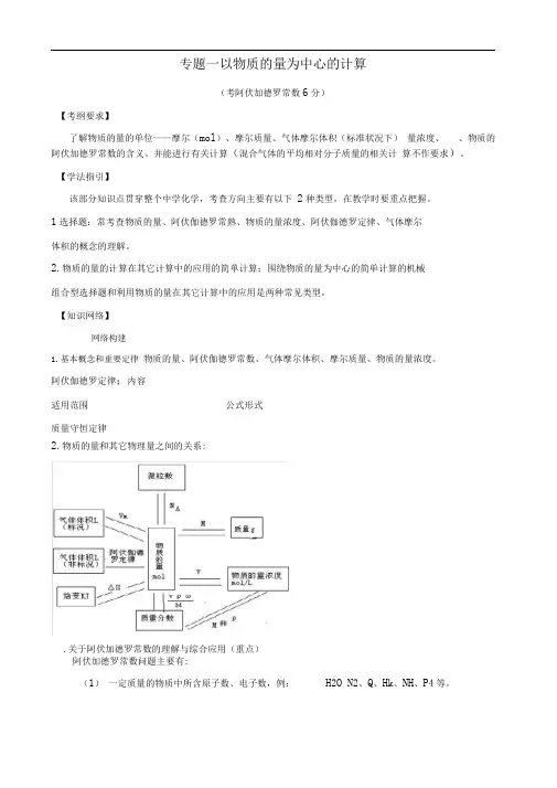 专题一以物质的量为中心的计算(考阿伏加德罗常数6分)【考纲要求】了解物质的量的单位——摩尔(mol)、摩尔质量、气体摩尔体积(标准状况下)、物质的量浓度、阿伏加德罗常数的含义。