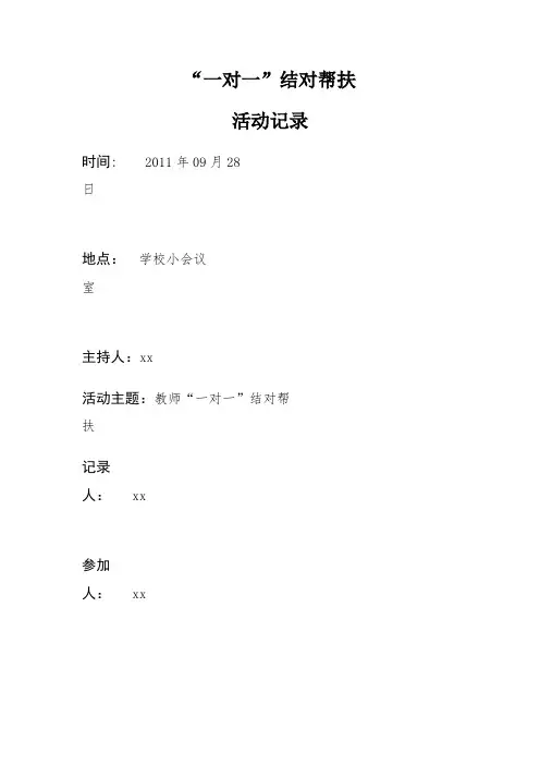 “一对一”结对帮扶活动记录时间:2011年09月28日地点:学校小会议室主持人:xx活动主题:教师“一对一”结对帮扶记录人:xx参加人:xx活动情况记载:一、活动背景与目的:1.由于数控技术应用专业的不断壮大,学校每年都会从外借调或者聘请一些数控专业的专业课老师来我校任教;2.新进专业课老师缓解了组内老师的任课压力,但由于他们缺乏教学一线的宝贵经验,导致专业水平不能正常发挥;3.因此,新进教师迫切需要教学方法的培训和诱导;4.充分利用学校现有资源对新进教师进行培训,安排有丰富教学经验的骨干教师和老教师对其进行“一对一”帮扶是最有效的方式。