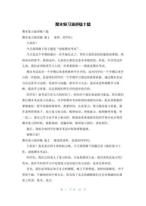 争分夺秒备战期末演讲稿(精选15篇)(实用版)编制人:__________________审核人:__________________审批人:__________________编制单位:__________________编制时间:____年____月____日序言下载提示:该文档是本店铺精心编制而成的,希望大家下载后,能够帮助大家解决实际问题。