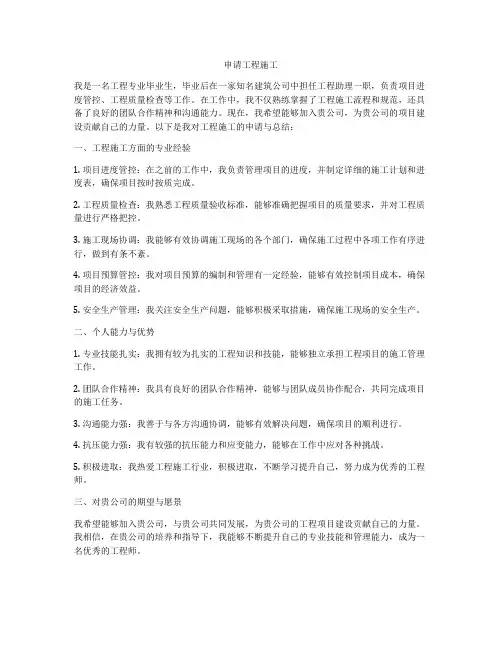 申请工程施工我是一名工程专业毕业生,毕业后在一家知名建筑公司中担任工程助理一职,负责项目进度管控、工程质量检查等工作。