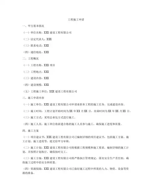 一、甲方基本情况(一)单位名称:XXX建设工程有限公司(二)法定代表人:XXX(三)联系电话:XXX(四)通信地址:XXX二、工程概况(一)工程名称:XXX项目(二)工程地点:XXX(三)建设内容:XXX(四)建设规模:XXX(五)工程施工单位:XXX建设工程有限公司三、施工申请内容(一)施工单位:XXX建设工程有限公司申请承担本工程的施工任务,完成建设内容。