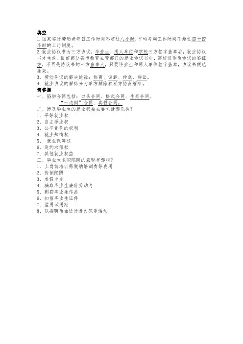 A:应当,违约B:无须,违约C:应当,解除D:无须,解除答案:A7.下列哪一种项不属于大学生就业风险()A:竞业禁止B:就业歧视C:虚假招聘D:协议违约答案:A8.下列关于招聘中的做法,哪一项不属于就业歧视()A:某用人单位以毕业生体检乙肝项目不不符合录用条件为由拒绝录用B:某律师事务所招聘一名实习生,要求必须通过国家司法考试C:某公司招聘一名会计,要求女性,年龄18到25岁,五官端正D:某银行重要岗位招聘毕业生,招聘条件为985高校毕业研究生答案:B9.关于大学生创业中法律风险的控制和防范,你认为如下哪一种方法最不可取?A:聘请律师或者法律顾问,招聘有法律专业背景的人员B:参加法律教育培训C:进行风险评估,拒绝有风险的事情D:学习法律专业知识,留心实践过程中可能产生的法律风险答案:C10.以下关于大学生创业的说法,错误的是()A:大学生创业对国家意义重大,对个人影响一般B:大学生创业有助于提升社会职业发展水平C:大学生创业有利于提升大学生的创新精神和能力D:大学生创业有利于促进国家和社会就业压力答案:A大学生在校期间“就业”法律性质探讨1.大学生暑假打工是否属于非全日制用工的形式,对此说法不一。