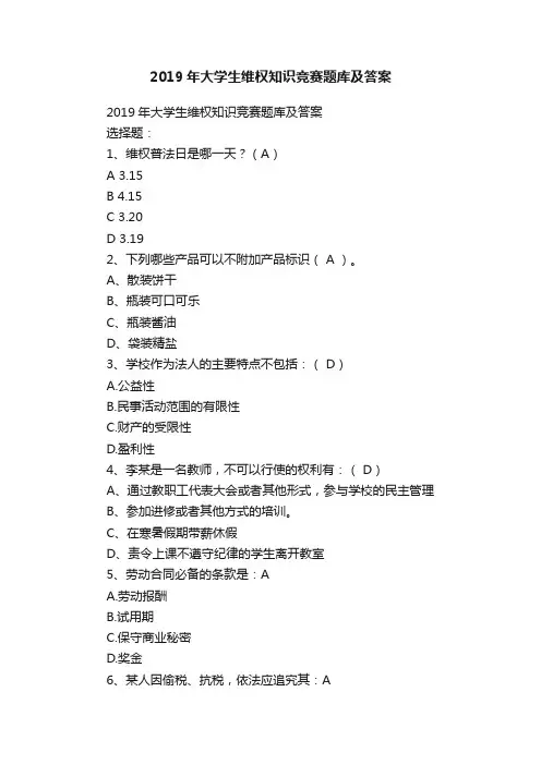 2019年大学生维权知识竞赛题库及答案2019年大学生维权知识竞赛题库及答案选择题:1、维权普法日是哪一天?(A)A 3.15B 4.15C 3.20D 3.192、下列哪些产品可以不附加产品标识( A )。
