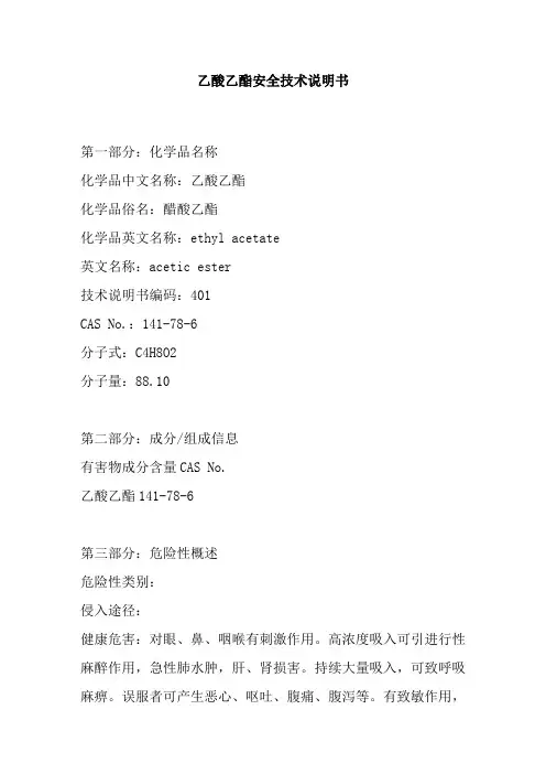 乙酸乙酯安全技术说明书第一部分:化学品名称化学品中文名称:乙酸乙酯化学品俗名:醋酸乙酯化学品英文名称:ethyl acetate英文名称:acetic ester技术说明书编码:401CAS No.:141-78-6分子式:C4H8O2分子量:88.10第二部分:成分/组成信息有害物成分含量CAS No.乙酸乙酯141-78-6第三部分:危险性概述危险性类别:侵入途径:健康危害:对眼、鼻、咽喉有刺激作用。