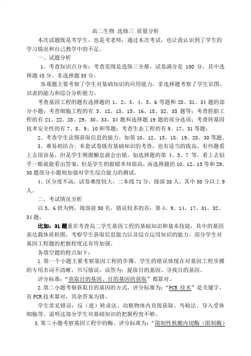 高二生物选修三质量分析本次试题既是考学生,也是考老师,通过本次考试,也让我认识到了学生的学习情况和自己教学中的不足。