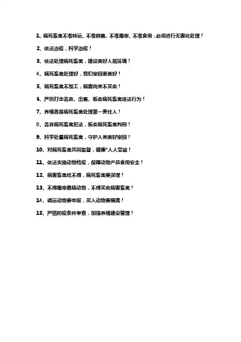 本文部分内容来自网络整理,本司不为其真实性负责,如有异议或侵权请及时联系,本司将立即删除!== 本文为word格式,下载后可方便编辑和修改! ==卫生监督职能工作标语篇一:宣传标语动物卫生监督宣传标语1、病死畜禽不准转运、不准销售、不准屠宰、不准食用,必须进行无害化处理!2、依法治疫,科学治疫!3、依法处理病死畜禽,建设美好人居环境!4、病死畜禽处理好,我们家园更美好!5、病死畜禽不加工,病害肉类不买卖!6、严厉打击丢弃、出售、贩卖病死畜禽违法行为!7、养殖者是病死畜禽处理第一责任人!8、丢弃病死畜禽犯法,贩卖病死畜禽判刑!9、科学处置病死畜禽,守护人类美好家园!10、对病死畜禽共同监督,健康和谐人人受益!11、依法实施动物检疫,保障动物产品食用安全!12、病害畜禽吃不得,病死畜禽要深埋!13、不得屠宰患病动物,不得买卖病害畜禽!14、调运动物要申报,买入动物要隔离!15、严格防疫条件审查,加强养殖建设管理!动物防疫宣传标语1、贯彻《动物防疫法》,大力发展现代畜牧业!2、畜禽养殖成败在防疫,效益在规模!3、防疫就是增收,少死就能增效!4、履行强制免疫义务,提高疫病防控水平!5、防疫知识进万家,促进发展保安全!6、增强动物防疫意识,规范畜禽养殖行为!7、防疫知识进万家,健康养殖促发展!8、饲养动物应免疫,出售动物须检疫!9、发现动物疫情快报告,发现买卖病害畜禽应举报!10、严格动物防疫条件,规范动物防疫行为!11、搞好动物防疫,促进社会经济全面、协调、可持续发展!12、发现疫情快报告,发现违章速举报!13、加强动物防疫工作,促进养殖业健康发展!14、搞好动物防疫,保障公共安全!15、报告动物疫情是每个公民的义务!篇二:公司各部门职责标语会计岗位的职责1、遵纪守法,忠于职守,廉洁奉公,实事求是。