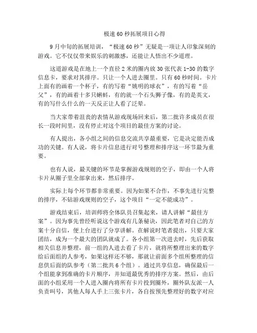 急速60秒拓展项目介绍【项目概述】1.项目名称:极速60秒2.项目类别:室外,团队竞争3.学员人数:二至三对为佳4.总培训时间:90分钟活动布置时间:10分钟活动进行时间:40分钟回顾总结时间:40分钟5.培训场地:室外有草地最佳,空场次佳,室内足够空间亦可【项目布置】一、培训器材:少于等于四个队都可用一套器材(1)一套(30张)极速60秒卡片,反正面彩打(2)一根12米左右的绳子(划定区域用)(3)计时手表(4)每个队一个立式白板(或大白纸),几支笔选用二、项目描述+规则下面要进行的项目会考验团队的速度,智慧与激情,尽量短的时间内需要把散落在绳子区域内的代表数字1~30的卡片按顺序拿出来。