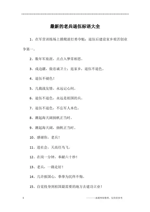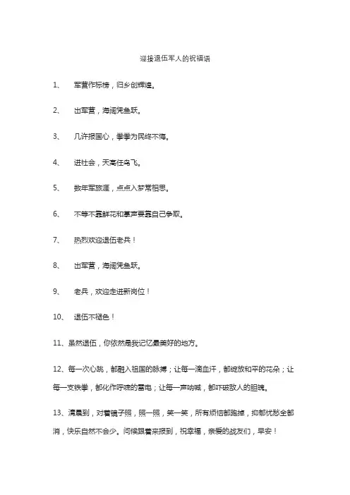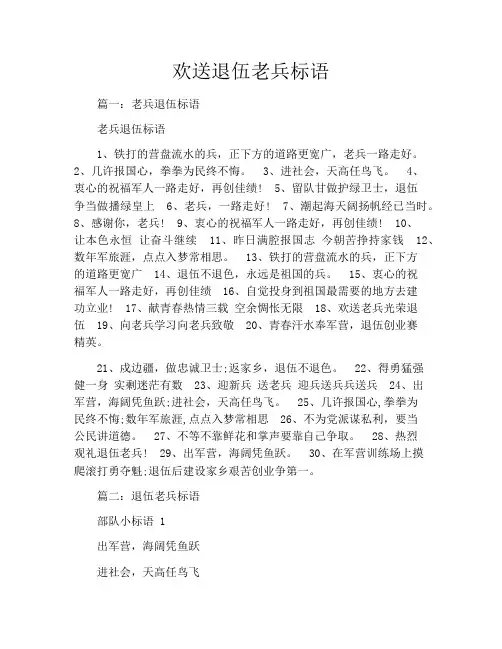 16、自觉投身到祖国最需要的地方去建功立业!17、献青春热情三载、空余惆怅无限18、欢送老兵光荣退伍19、向老兵学习向老兵致敬20、青春汗水奉军营,退伍创业赛精英。