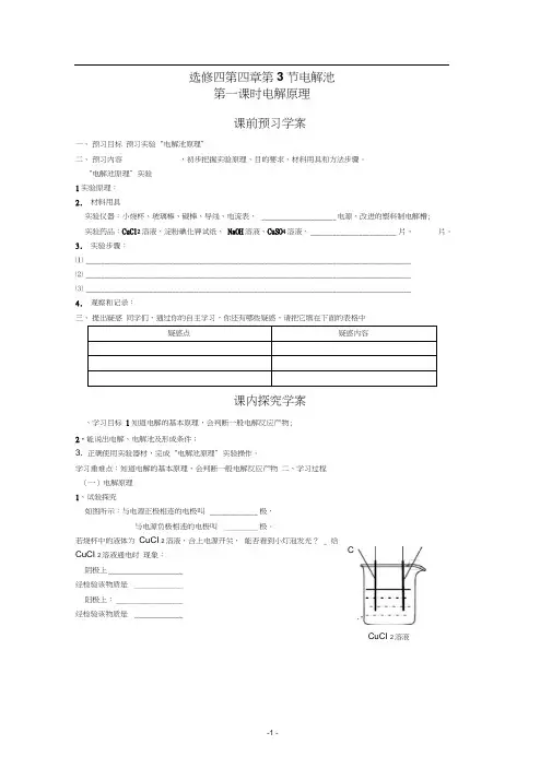 选修四第四章第3节电解池第一课时电解原理课前预习学案一、 预习目标 预习实验“电解池原理” 二、 预习内容 “电解池原理”实验 1实验原理: 2. 材料用具实验仪器:小烧杯、玻璃棒、碳棒、导线、电流表、 ____________________ 电源、改进的塑料制电解槽; 实验药品:CuCl 2溶液、淀粉碘化钾试纸、 NaOH 溶液、CuSO 4溶液、 _______________________ 片、 3. 实验步骤:⑴ _______________________________________________________________________________________ ⑵ _______________________________________________________________________________________ ⑶ _______________________________________________________________________________________ 4. 观察和记录:三、 提出疑惑 同学们,通过你的自主学习,你还有哪些疑惑,请把它填在下面的表格中疑惑点疑惑内容课内探究学案、学习目标 1知道电解的基本原理,会判断一般电解反应产物; 2•能说出电解、电解池及形成条件;3. 正确使用实验器材,完成“电解池原理”实验操作。