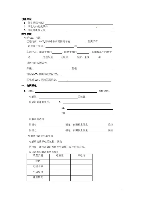 二、预备知识1、什么是原电池?2、原电池的构成条件3、电极及电极反应三、探究导航1、新知导学-----电解原理:溶液(1)电解CuCl2①通电前,CuCl溶液中存在的阳离子有,阴离子2有,这些离子来自于和②通电后,阳离子移向,阴离子移向。