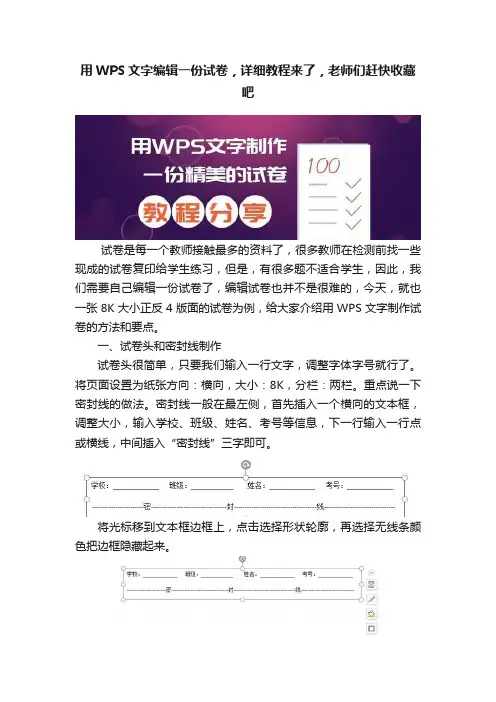 用WPS文字编辑一份试卷,详细教程来了,老师们赶快收藏吧试卷是每一个教师接触最多的资料了,很多教师在检测前找一些现成的试卷复印给学生练习,但是,有很多题不适合学生,因此,我们需要自己编辑一份试卷了,编辑试卷也并不是很难的,今天,就也一张8K大小正反4版面的试卷为例,给大家介绍用WPS文字制作试卷的方法和要点。