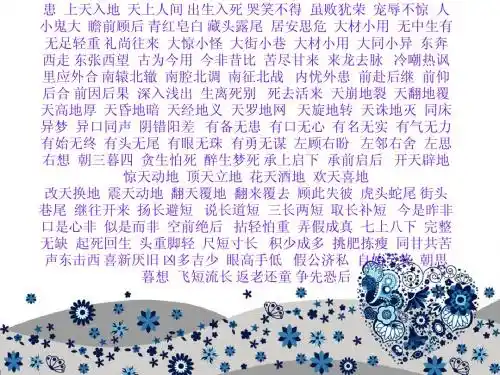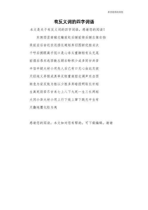 含反义词的四字词语含反义词的四字词语(一):常见的含反义词的四字词语前两个字是反义词的四字词语:悲喜交加,悲欢离合,祸福相依,哭笑不得,坐立不安第一和第三个字是反义词的四字词语:今非昔比,苦尽甘来,来龙去脉,冷嘲热讽,里应外合第二个字和第四个字是反义词的词语:醉生梦死,空前绝后,顾此失彼,取长补短,口是心非后两个字是反义词的四字词语:人情冷暖,不顾安危,难分高下,不知深浅,颠倒黑白第二和第三个字是反义词的四字词语:功败垂成,进退两难,悲喜交加,黑白分明,进退维谷含反义词的四字词语(二):一、1和2位是反义词的词语:悲喜交加,黑白分明,功败垂成,进退两难,进退维谷,轻重缓急,轻重倒置,生死存亡,生死攸关始终如一,是非曲直,阴阳怪气,左右逢源二、1和3位是反义词的词语:1、眼高手低,喜新厌旧,口是心非,头重脚轻,有头无尾,前倨后恭,东逃西散,南辕北辙,左顾右盼2、来龙去脉,冷嘲热讽,里应外合,南辕北辙,南腔北调,南征北战,内忧外患,前赴后继,前仆后继3、三长两短,弱肉强食,水深火热,早出晚归,取长补短,大惊小怪,大材小用,九死一生,异口同声4、承上启下,南辕北辙,人来人往,承前启后,反败为胜,化敌为友,化险为夷,去粗取精,阴差阳错5、里应外合,好逸恶劳,前赴后继,深入浅出,内忧外患,横七竖八,嘘寒问暖,转危为安,弄巧成拙6、天昏地暗,天经地义,天罗地网,天旋地转,天诛地灭,同床异梦,异口同声,异曲同工,阴错阳差7、有勇无谋,左顾右盼,左邻右舍,左思右想,上行下效,朝令暮改,朝三暮四,前呼后拥,东倒西歪8、掐头去尾,求同存异,左右开弓,左拥右抱,左右逢源,先来后到,争先恐后,大同小异9、惹是生非,惹事生非,推陈出新,貌合神离,顾此失彼,左邻右舍,惊天动地,开天辟地,欢天喜地10、街头巷尾,生离死别,阴晴圆缺,生死存亡,眉来眼去,柳暗花明,南辕北辙,洋为中用,前俯后仰11、有备无患,有口无心,有名无实,有气无力,有始无终,有恃无恐,有头无尾,有天无日,有眼无珠12、大惊小怪,大街小巷,大材小用,大同小异,东奔西走,东张西望,古为今用,今非昔比,苦尽甘来13、虎头蛇尾,天崩地裂,一决雌雄,阳奉阴违,乐极生悲,无中生有,有勇无谋,人情冷暖,前仰后合14、积少成多,朝秦暮楚,出生入死,舍生求死,七上八下,进退两难,天长地久,东张西望,貌合神离15、前仰后合,前因后果,深入浅出,生离死别,死去活来,天崩地裂,天翻地覆,天高地厚,天高地迥三、2—4位是反义词的词语:1、喜新厌旧,口是心非,头重脚轻,有头无尾,前倨后恭,东逃西散,南辕北辙,左顾右盼,积少成多2、弱肉强食,水深火热,早出晚归,取长补短,大惊小怪,大材小用,九死一生,异口同声,街头巷尾3、南辕北辙,人来人往,承前启后,反败为胜,化敌为友,化险为夷,去粗取精,阴差阳错,虎头蛇尾4、欢天喜地,改天换地,经天纬地,遮天盖地,震天动地,翻天覆地,翻来覆去,顾此失彼,厚此薄彼5、舍生忘死,贪生怕死,醉生梦死,承上启下,承前启后,开天辟地,惊天动地,顶天立地,花天酒地6、生离死别,阴晴圆缺,生死存亡,眉来眼去,柳暗花明,南辕北辙,洋为中用,前俯后仰,里应外合7、口是心非,似是而非,空前绝后,除旧布新,你死我活,拈轻怕重,弄假成真,七上八下,欺上瞒下8、虎头蛇尾,街头巷尾,继往开来,扬长避短,说长道短,三长两短,截长补短,取长补短,今是昨非9、惹事生非,推陈出新,貌合神离,顾此失彼,左邻右舍,惊天动地,开天辟地,欢天喜地,承上启下10、求同存异,左右开弓,左拥右抱,左右逢源,先来后到,争先恐后,大同小异,掐头去尾11、好逸恶劳,前赴后继,深入浅出,内忧外患,横七竖八,嘘寒问暖,转危为安,弄巧成拙,惹是生非12、完整无缺,借古讽今,颂古非今,起死回生,避重就轻,头重脚轻,将信将疑,尺短寸长,积少成多13、瞻前顾后,挑肥拣瘦,同甘共苦,声东击西,喜新厌旧,凶多吉少,眼高手低,假公济私,惩前毖后14、天崩地裂,一决雌雄,阳奉阴违,乐极生悲,无中生有,有勇无谋,人情冷暖,前仰后合15、自始至终,朝思暮想,飞短流长,返老还童,争先恐后,转败为胜,前呼后拥,东倒西歪,眼高手低16、朝秦暮楚,出生入死,舍生求死,七上八下,进退两难,天长地久,东张西望,貌合神离,三长两短四、3—4位是反义词的词语:不关痛痒,颠倒黑白,混淆黑白,混淆是非,颠倒是非,举足轻重,无足轻重,礼尚往来五、1—4位是反义词的词语:公而忘私,死里逃生。