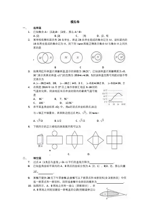 模拟卷一、选择题1.已知集合A={2,3},B={3,5},那么A∩B=A. {2}B. {3}C. {5}D.{2,5}2.某学校街舞社团共有26名学生,若这26名学生组成的集合记为M,该社团内的16名男生组成的集合记为N,则下列Venn图能正确表示集合M与集合N之间关系的是A B C D3.如果用红外体温计测量体温,显示的读数为℃,已知该体温计测量精度为±℃,表示其真实体温x(℃)的范围为≤x≤,则该体温范围可用绝对值不等式表示为A. ||≤B. ||≥C. ||≤D. ||≥4.右图是2016年11月27日上海市徐家汇地区6-18时的气温变化图,则该地区当日在该时段内的最高气温可能是A. 6℃B. ℃C. 10℃D. ℃5.在平面直角坐标系xOy中,角α的顶点在坐标原点,始边与x轴正半轴重合,若其终边经过点P(1,),则tanα=A. /3B. 1/2C. /2D.6.下图所示的正三棱柱的表面展开图可以为A B. C. D.二、填空题7.过点A(1,5)且与直线y=3x+1平行的直线方程为。