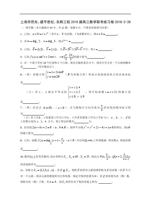 上海市侨光、建平世纪、东辉三校2018届高三数学联考练习卷2018-2-28一、填空题(本大题满分44分,共11题,每题4分,只要求直接填写结果)1、已知:4i i bi a +=+(其中a 、b 为实数,i 为虚数单位)。