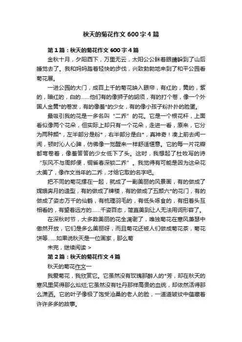 秋天的菊花作文600字优秀秋天的菊花作文600字优秀范文我爱美丽的菊花,更爱拥有菊花精神的人,也愿我自己成为拥有着菊花精神的人。
