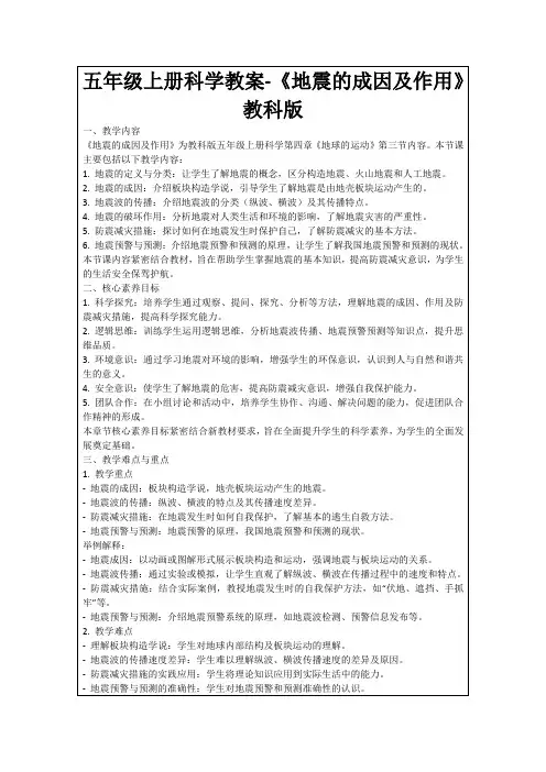 小学科学23《地震的成因及作用》(教案)地震的成因及作用地震是地球表面普遍存在的自然灾害,给人们带来了巨大的伤害和损失。