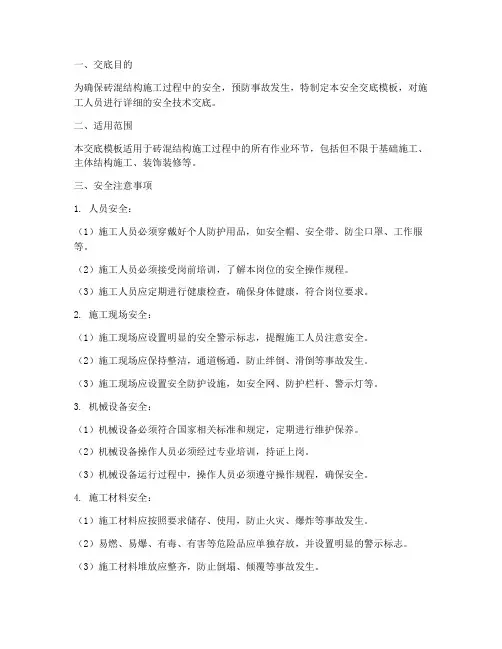 二、适用范围本安全交底适用于所有参与砖混结构施工的施工人员、管理人员和监理人员。