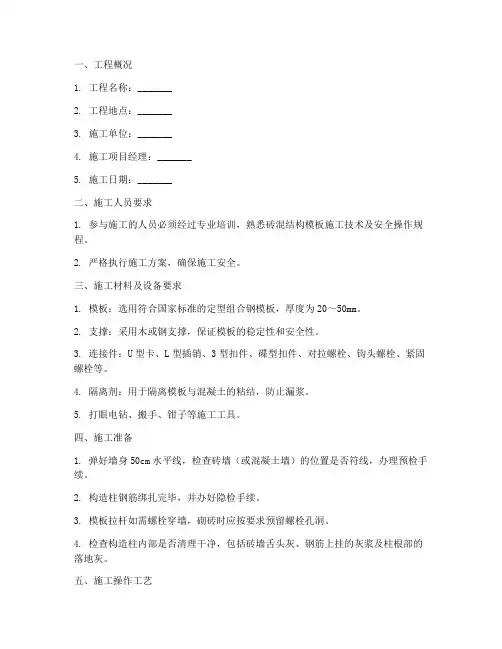 一、工程概况1. 工程名称:_______2. 工程地点:_______3. 施工单位:_______4. 施工项目经理:_______5. 施工日期:_______二、施工人员要求1. 参与施工的人员必须经过专业培训,熟悉砖混结构模板施工技术及安全操作规程。