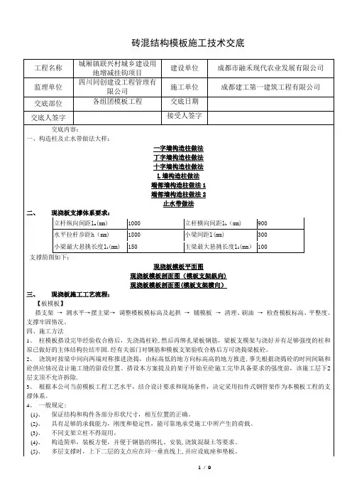 砖混结构模板施工技术交底本技术交底适用于工业与民用建筑砖混结构,外墙内模和外板内模结构构造柱、圈梁、板缝的支模板工程。